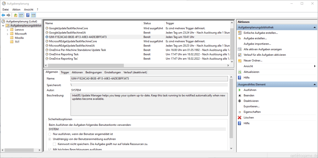 Dort angekommen finden wir im Baum unter Aufgabenplanungsbibliothek einige Einträge, die von Programmen Dritthersteller angelegt wurden.
